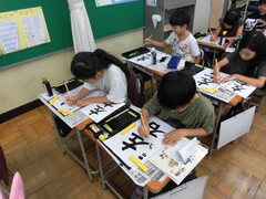 4年生 毛筆の様子です。「すー、とんっ」と声を出しながら、プリントになぞり書きをして、字形を確かめました。練習を経て「林」の文字を丁寧に書くことができました。