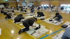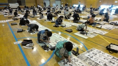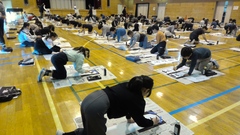1,2時間目に3年生。3,4時間目は4年生。5時間目には5年生が席書会に臨みました。各学年が「お正月」「美しい空」「初日の出」の言葉を和紙に墨と筆を使って、広い体育館でのびのびと書くことができました。墨の香りがする静かな体育館で、緊張した面持ちで書く姿にすがすがしさを感じました。日本の伝統文化である「書き初め」を継承する意味と良さを感じられたような気がしました。
