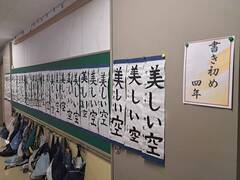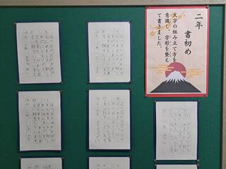 1/14日~1/23まで、「書き初め展」が始まります。一年生・二年生は、心を落ち着かせて一画一画ていねいに書いた硬筆の作品に挑戦しました。三年生から六年生は、毛筆で文字と向き合い、筆の運びや力強さにそれぞれの成長が感じられます。年新たに、よいスタートを切ろうとする気持ちが、のびやかな文字や真剣な表情から伝わってきます。子どもたち一人ひとりの思いと努力が詰まった作品を、ぜひご覧ください。