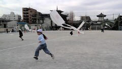 1年生は、生活科の学習で、凧あげをしました。白い不織布に、空に浮かぶことを考えながら自分の好きな絵や模様をクレパスで描き、世界にひとつだけの凧が完成しました。校庭に出ると、風を感じながら一生懸命に走る子供たちの姿が見られました。「飛んだ!」「楽しい!」と、あちこちから嬉しそうな声が聞こえてきました。自然の力を体いっぱいに感じながら、笑顔あふれる学習の時間となりました。
