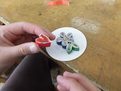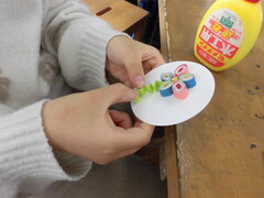 4年生の図工では、細長い紙をつまようじに巻き付けて、ぐるぐるとした形を活かした装飾を作りました。つまようじに紙を細かく巻き付けるときは、集中して静かに取り組んでいました。できたぐるぐるもようを、お花やちょうちょに見立てて丸いコースターに貼っていきました。「これ何に見える?」と作品を見せ合って、楽しく活動することができました。