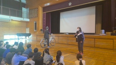 交通安全指導員の方と池上警察の方がいらして、自転車の点検の仕方、自転車に乗るときの規則やマナーについて教えてくださいました。子どもたちにとって、身近な自転車は、便利で快適なものですが、乗り方や扱い方によっては危険な一面もあります。正しく扱い、正しく乗って安全に使用してほしいと思います。最後に、「自転車教室修了証」をいただきました。