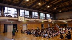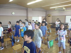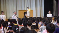 朝、体育館に全学年が集まって終業式を行いました。校長先生からは、夏休み取り組んでほしいこととして、家のお手伝いと読書についての話がありました。児童代表の言葉は、3年生です。漢字や計算の練習、運動会でのフラフープを使ったダンスを頑張ったことのスピーチがありました。みんなの前で話すことは大変緊張します。一人一人のスピーチに対して、大きな拍手が送られました。