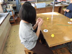 4年生の図工では、細長い紙をつまようじに巻き付けて、ぐるぐるとした形を活かした装飾を作りました。つまようじに紙を細かく巻き付けるときは、集中して静かに取り組んでいました。できたぐるぐるもようを、お花やちょうちょに見立てて丸いコースターに貼っていきました。「これ何に見える?」と作品を見せ合って、楽しく活動することができました。