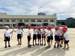 今朝はスポーツフェスタでリレーに出場する児童がチーム練習を行っていました。リレーではバトンの受け渡しが肝です。チームごとに声を掛け合いながらいかにスムーズに受け渡せるか何度も確認しながら練習していました。