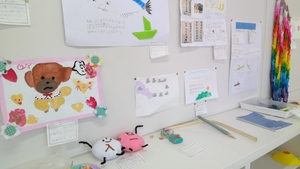 新校舎になって、通級指導学級のきこえとことばの教室も一緒の場所になりました。今日は3年五組さんが勉強のため見学をしました。