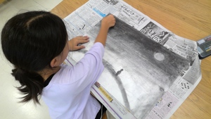 水墨画のような絵をかいていた4年生。木炭をつかって絵をかくためのイメージづくりをしているようです。「アンモナイトのようなものをかいたよ」と見せてくれました。濃淡を生かして雰囲気のある絵が仕上がっています。