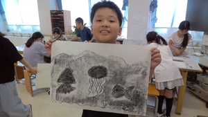 木炭のみで絵を描いていた4年生。グラデーションをうまく使って濃淡を出し、奥行きある絵に仕上げていました。「みんなに見てもらっていいです」と声をかけてもらい、写真をパチリ。笑顔で作品を見せてくれました。
