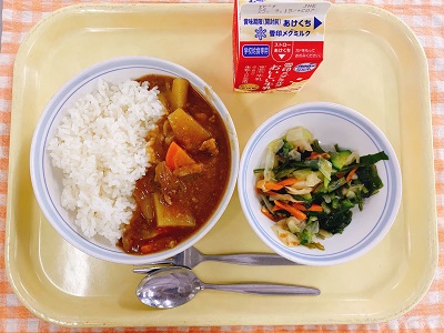 牛乳 ドライカレーライス パリパリサラダ 豆乳スープ