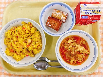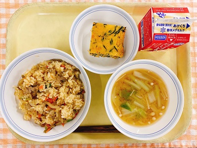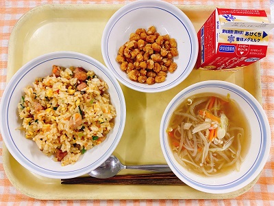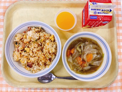 牛乳 小松菜チャーハン 米粉めんの中華スープ フルーツヨーグルト