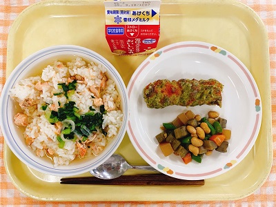 牛乳 鮭だし茶漬け ちくわの磯辺揚げ 大豆の五目煮