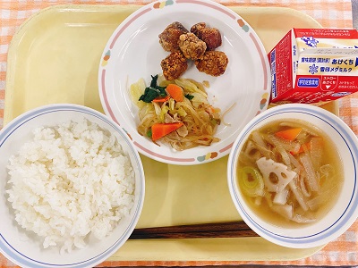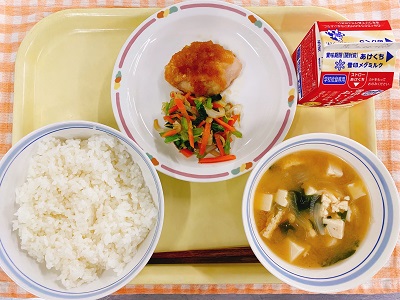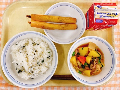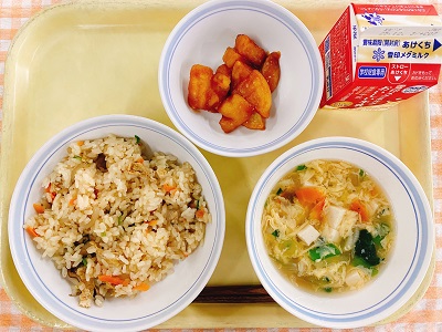 牛乳 きんぴらご飯 かつおのカレー揚げ とうふのすまし汁