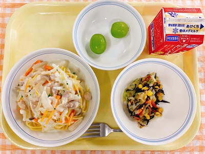 牛乳 スパゲティクリームソース ひじきとコーンのサラダ シャインマスカット