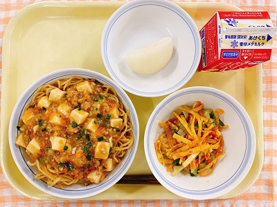 牛乳 麻婆あんかけ焼きそば パリパリサラダ 梨