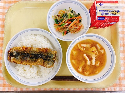 牛乳 ごはん さんまの姿煮 小松菜の和え物 みそ汁