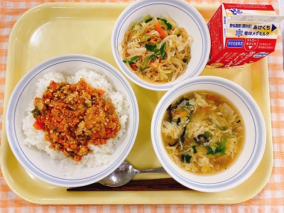 牛乳 ガパオライス 春雨サラダ えびと卵のスープ