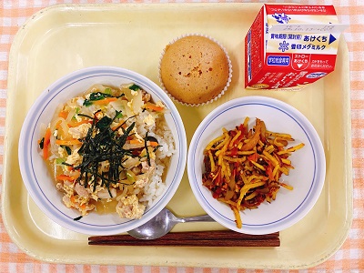 牛乳 鶏飯 さつまいものきんぴら ふくれ菓子