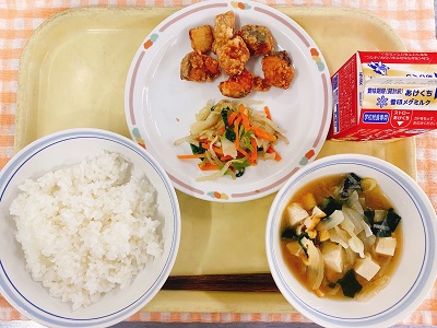 牛乳 ご飯 きびなごのから揚げ ごまあえ スタミナみそ汁