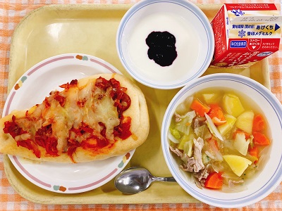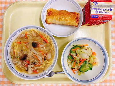 牛乳 スパゲティペペロンチーノ トマトと卵のスープ アップルパイ