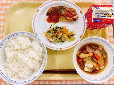 牛乳 さつまいもご飯 鮭の紅葉焼き 豚汁