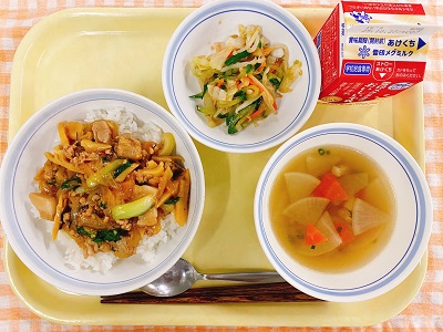 牛乳 うま煮丼 かぶの中華和え オレンジゼリー