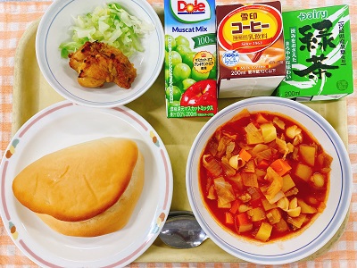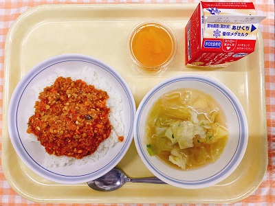 牛乳 ドライカレーライス キャベツとじゃがいものスープ サイダーゼリー