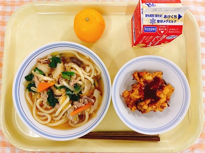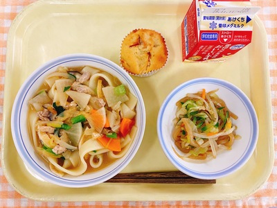 牛乳 おっきりこみうどん こんにゃくサラダ りんごのケーキ