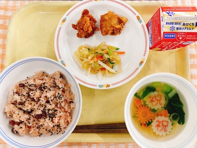 牛乳 赤飯 鶏のからあげ 大根サラダ お祝いすまし汁