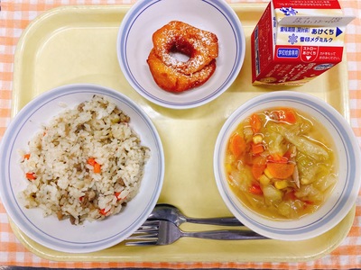 牛乳 チキンごぼうピラフ キャベツとコーンのスープ かぼちゃのドーナツ