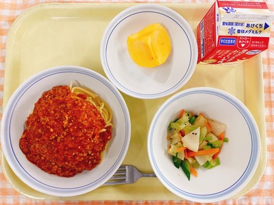 牛乳 スパゲティミートソース かぶのイタリアンサラダ 柿