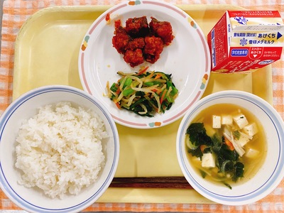 牛乳 ご飯 ヤンニョムチキン 小松菜のナムル わかめと卵のスープ