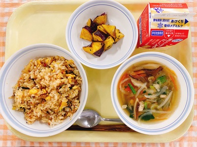 牛乳 ひじキムチチャーハン 大学芋 春雨スープ