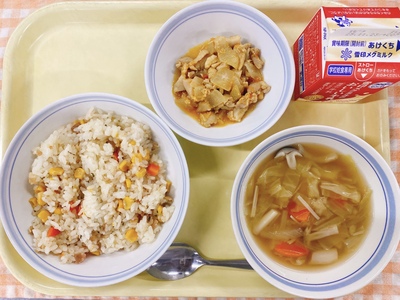 牛乳 チキンライス 具だくさんオムレツ キャベツとコーンのスープ
