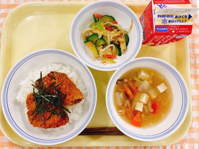 牛乳 ブリカツ丼(こしひかり) 野菜の酢醤油がけ のっぺい汁