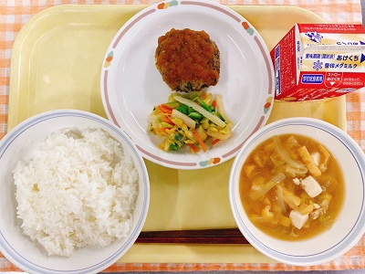 牛乳 ご飯 ハンバーグ コーンポテト 白菜とベーコンのスープ