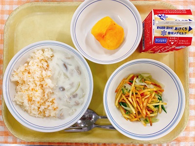 牛乳 キャロットライスのクリームソースがけ じゃがいものハニーサラダ 柿