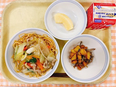 牛乳 あんかけ焼きそば 大豆と小魚の揚げ煮 りんご