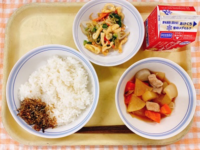 牛乳 ご飯 骨太ふりかけ 大根と豚肉のべっこう煮 カリッと油揚げのごま和え