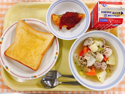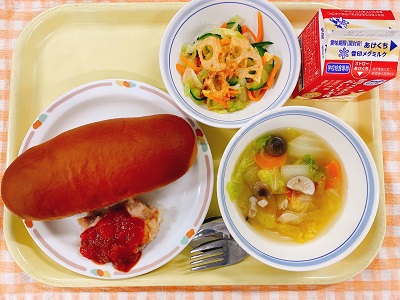 牛乳 ホットドッグ さつまいものクリームシチュー りんご