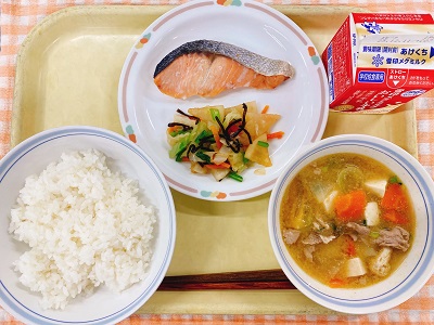 牛乳 ご飯(ひとめぼれ) 塩鮭 かぶの昆布和え ごま豚汁