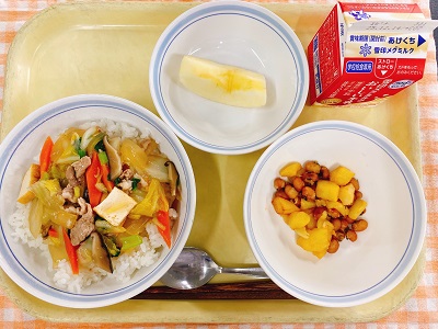 牛乳 厚揚げと白菜のうま煮丼 ビーンズポテト りんご
