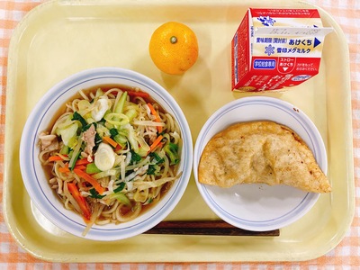 牛乳 醤油ラーメン 野菜たっぷり揚げぎょうざ みかん