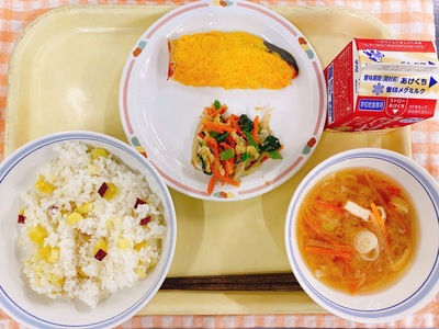 牛乳 さつまいもご飯 鮭のもみじ焼き ごまあえ みそ汁