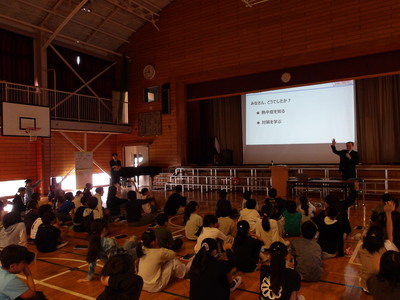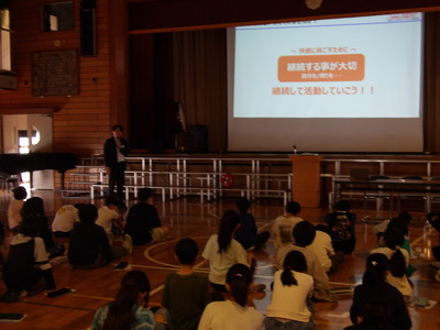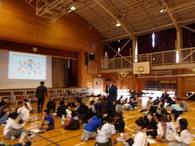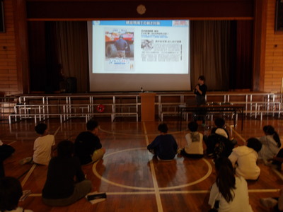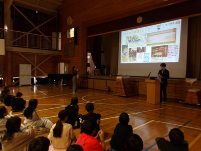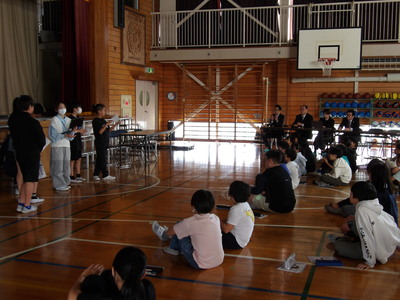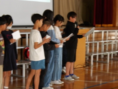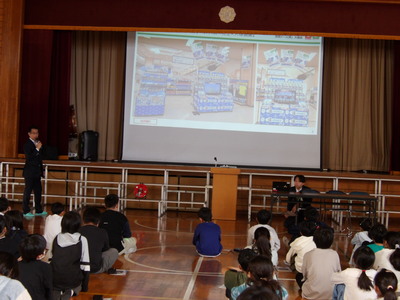 全校朝会で、新教科「大田の未来づくり」や花王さんとの関わりや自分たちが行っている取り組みについて5年生が説明をしました。
