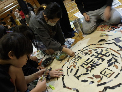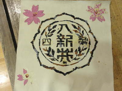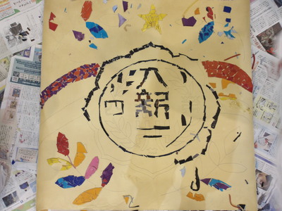 各クラスで校章のデザインコンテストを行い、様々な色の皮を張り合わせて、タペストリーを作ります。