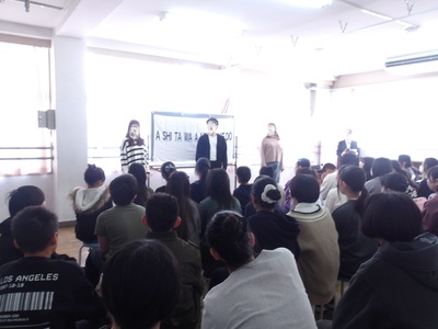 劇団四季の方々に来ていただき、話し方教室を実施していただきました。