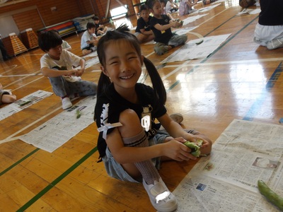 1年生が本日の給食の「ゆでそら豆」に向けて、そら豆のさや剥きを全校児童数分行ってくれました。