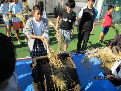 自分で育てた稲を、足踏み脱穀機や唐箕、千歯こき、精米機を使って、お米を収穫しました。
