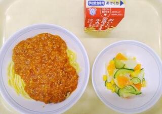 献立:スパゲティーミートソース 牛乳 ポテトサラダ産地:〇にんにく・・・青森 〇しょうが・・・高知 〇玉ねぎ・・・北海道 〇にんじん・・・静岡 〇パセリ・・・千葉 〇じゃがいも・・・鹿児島 〇きゅうり・・・茨城