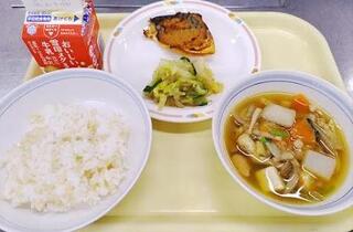 献立:胚芽ごはん 牛乳 魚のごまみそ焼き ゆで野菜の酢じょうゆかけ けんちん汁産地:〇しょうが・・・高知 〇キャベツ・・・愛知 〇もやし・・・栃木 〇きゅうり・・・茨城 〇ごぼう・・・青森 〇にんじん・・・徳島 〇だいこん・・・千葉 〇さといも・・・鹿児島 〇しめじ・・・長野 〇ねぎ・・・茨城 〇小松菜・・・東京